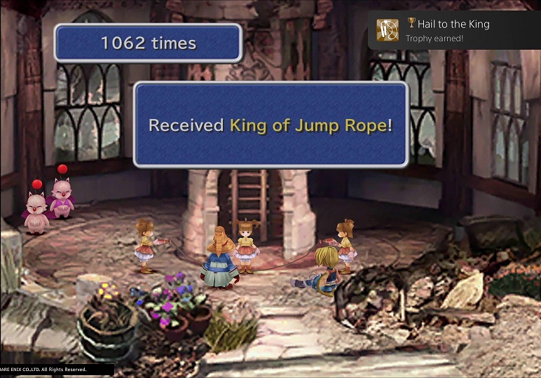 If you’re familiar with FF9 at all, I’ll bet this one immediately sprang to mind! It’s not a question of just tapping the button to the rhythm, oh no… the rhythm changes every few hundred skips, so you’ve got to be on your toes. And 1000 skips will take you almost 10 minutes of solid concentration. Fail… even at 800 or 900… and you’ll have to start all over. No wonder that the recommended method for this trophy involves using the PS4’s Remote Play feature and an automation script running on your PC!